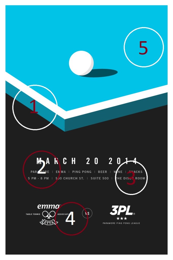 ALIGNMENT (#4) – While center alignment is typically frowned upon in design classes because it is the basic mistake beginners make, the proper use can create a clean design. Because the blue table draws your eyes downwards towards the center, it makes sense to center align the font. It also works with the limited amount of text needed on the poster.